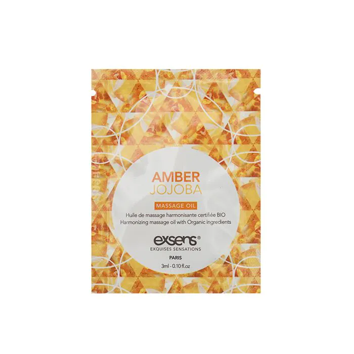 A 3ml single-dose amber jojoba massage oil from Exsens, blended for relaxing aromatherapy and skin hydration. Comes with small amber stones in the vial for their described energetic properties. Great if you want a travel-friendly, nourishing oil for short massages or intimate touch; not suited if you need a toy-safe or long-lasting multi-use bottle.