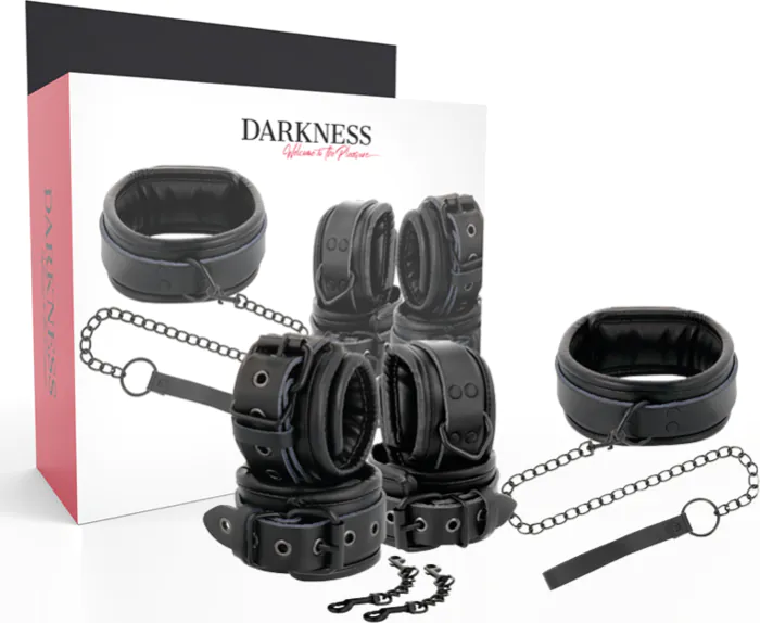 Experience the thrill of bondage with the DARKNESS set, featuring comfortable leather cuffs and a secure collar. Versatile for beginners and enthusiasts alike.