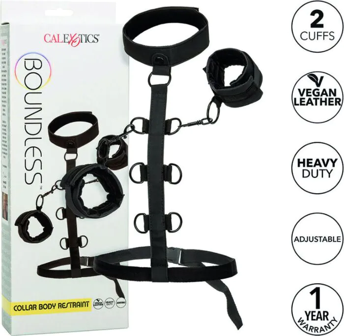 Experience thrilling bondage with the CalExotics Boundless Collar. This versatile restraint system with vegan leather cuffs is perfect for both beginners and enthusiasts, offering adjustable play for sensual adventures together.