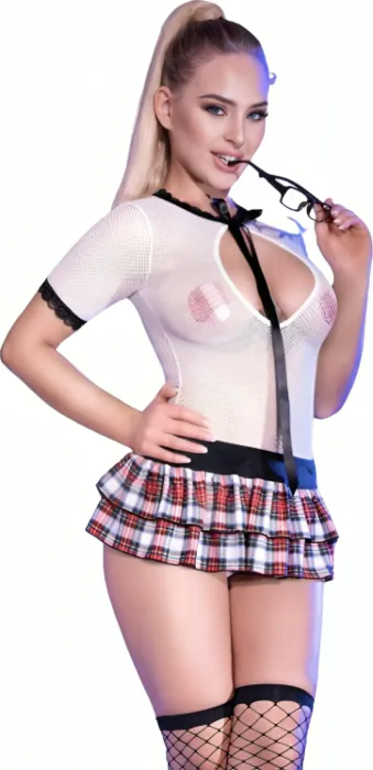 Channel your inner allure with this captivating schoolgirl outfit that balances playful innocence with seductive charm. Crafted from soft white mesh, the bodysuit highlights your figure and features delicately laced edges, adding an elegant touch. The playful plaid skirt draws attention to your legs, enhancing the ensemble's flirtatious vibe, while the matching glasses complete the classic schoolgirl look.