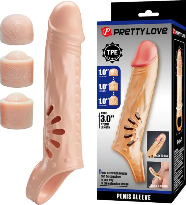 Enhanced length and girth with a flexible TPE sleeve that adapts to you. The Pretty Love Male Penis Sleeve includes three detachable extensions, allowing you to increase your size by up to 7.5 cm. Its textured design intensifies sensations during penetration, while a supportive ring at the base secures it in place for confident use.