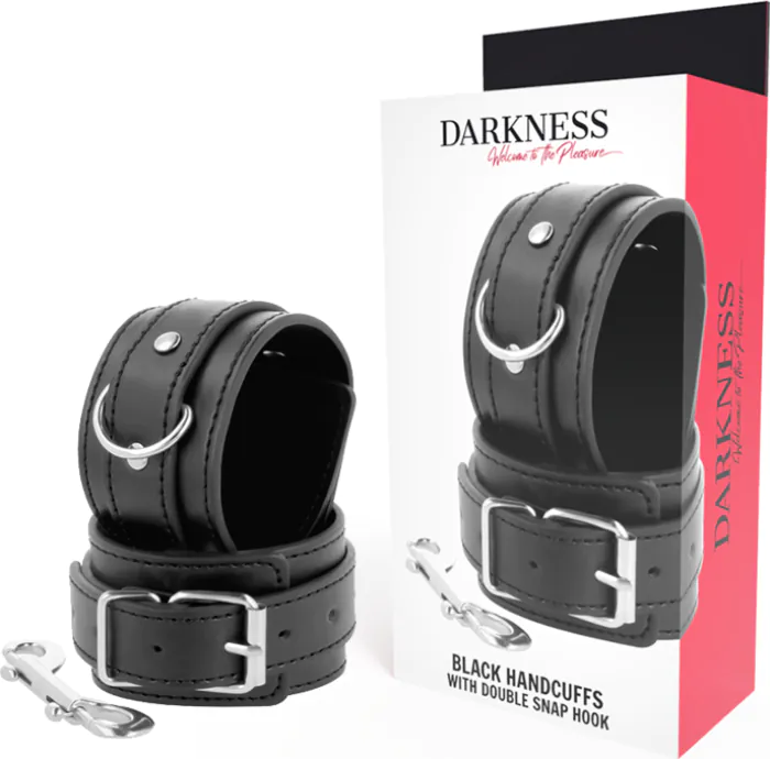 Intense restraint and a touch of elegance come together in these adjustable handcuffs from Darkness, hand sewn from durable PVC leather with double reinforcement tape. Resistente for those looking to enhance their intimate experiences with a secure yet comfortable fit.