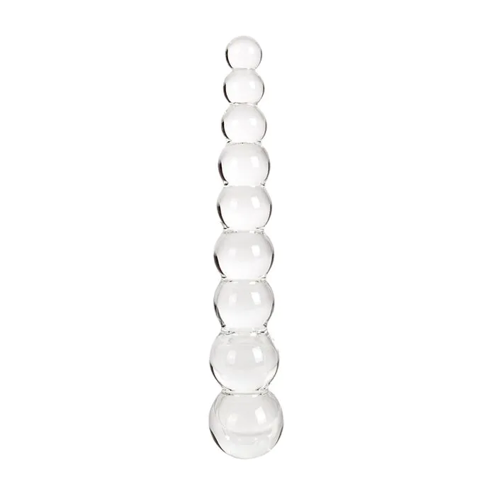A clear, high-strength glass dildo with a straight, bead-style shaft that increases in size from tip to base. Made for people starting anal play or anyone who prefers a firm, hygienic toy that also responds to temperature. Unlike flexible silicone toys, this one gives crisp, precise sensation and is fully submersible for easy cleaning and bath play.