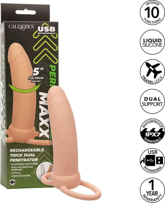 Intense dual penetration with 10 powerful vibration functions. The Performance Maxx Thick Dual Penetrator is crafted from silky liquid silicone, providing a smooth and comfortable experience that is also waterproof (IPX7 rated).