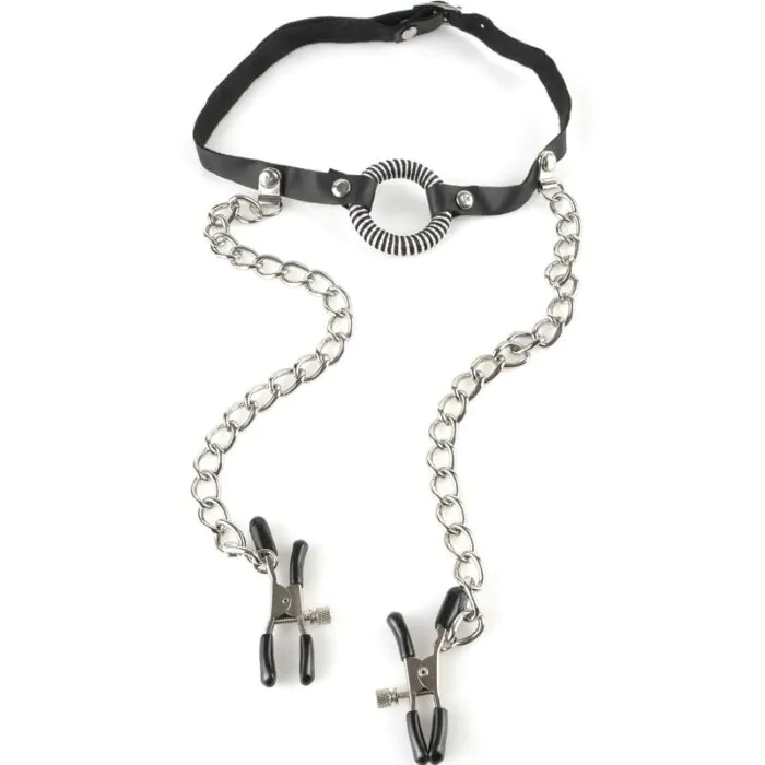 Dive into the world of BDSM with this adjustable gag featuring nipple clamps. Great for beginners looking to explore submission and control.