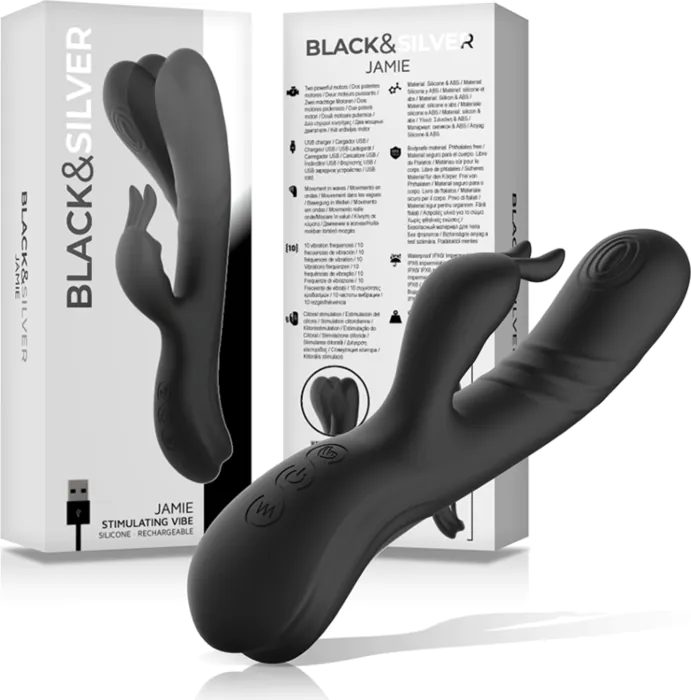 Double stimulation awaits you with the BLACK&SILVER Jamie vibrator. Designed to excite both the clitoris and G-spot simultaneously, it features two powerful motors for an enveloping experience. Crafted from body-safe silicone, its soft, silky texture adds to the pleasure.