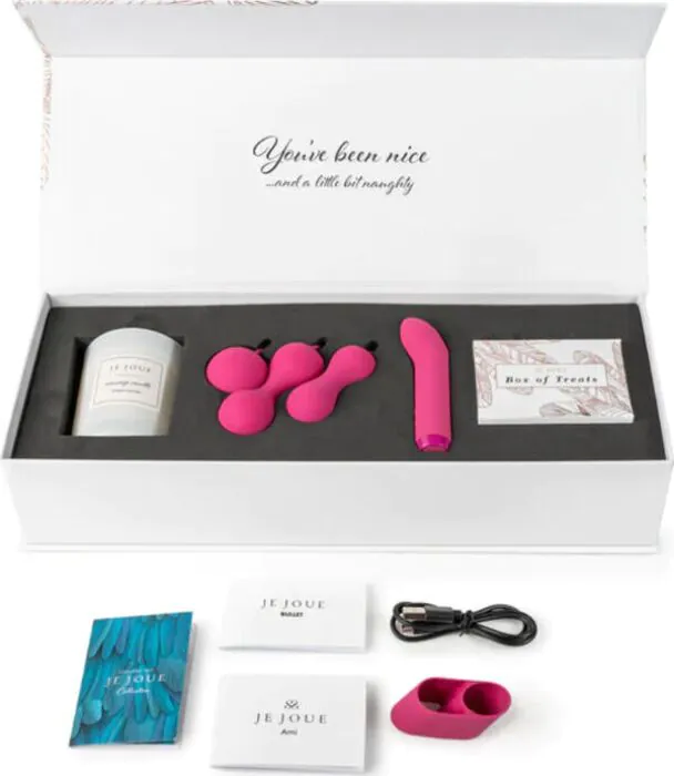 A limited‑edition Je Joue couples kit that brings together a small G‑spot bullet with a finger sleeve, the Ami 3‑step progressive Kegel set, a jasmine & lily massage candle and a Box of Treats. Presented in elegant rose‑gold feather packaging, it suits couples and beginners who want a thoughtful, ready‑made bundle for intimate wellness and pelvic‑floor training.