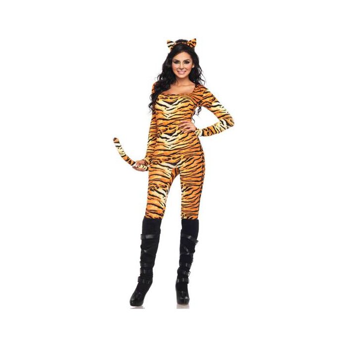 Disfraz de 2 piezas tigresa salvaje. Incluye catsuit con cola y diadema con orejas de tigre.