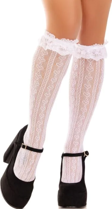 | Style | Knee-high with lace ruffle cuff and heart detail |