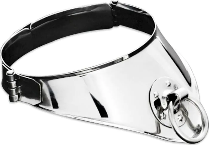 This is a rigid, lockable restraint collar made from stainless steel with chrome-plated brass details. It sits as a clear symbol of control or as a strong finishing touch to fetishwear, costumes or club outfits. The collar is lightweight and finished with smooth edges for comfort, and its design emphasises a classic, pointed front. What sets it apart are the lateral hinges that open outwards for simple on/off and a rear hole for a padlock, together with a front ring for attaching a leash or anchor.