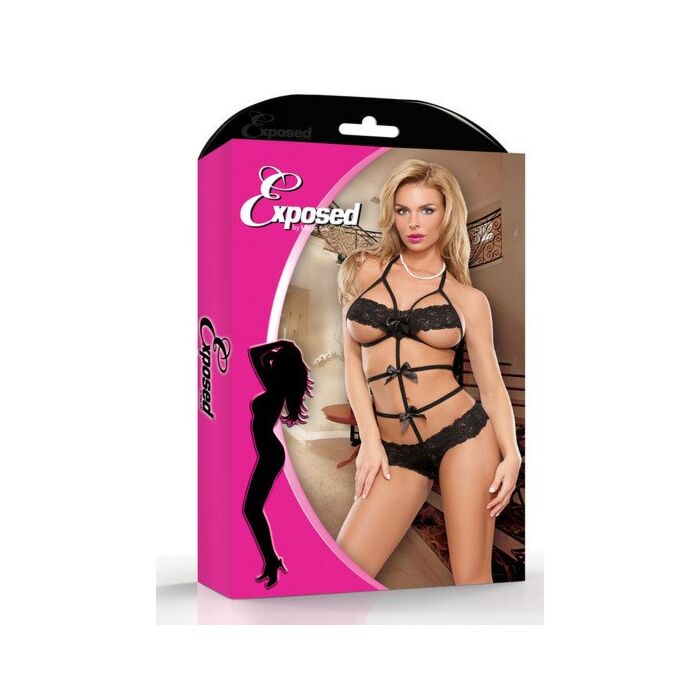 De la magnífica colección Magic Silk Exposed llega este body teddy negro unido por cintas y lazos y espalda descubierta unida por tiras, braguita de encaje que te hará sentir la más sexy.
