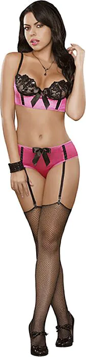 Unleash your inner confidence with this stunning two-piece lingerie set that beautifully contrasts black lace with soft pink satin. The bra features a delicate lace overlay, complemented by a mini corset style in satin, finished with a charming bow. The matching satin knickers, adorned with a bow at the centre, complete the look for an enticing ensemble that feels as good as it looks.