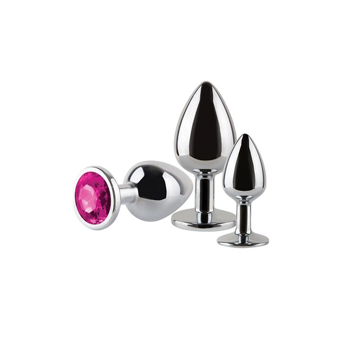 This is a pack of three metal anal plugs designed for progressive play. They share the same tapered, slim profile with a flat base finished in a circular jewellery piece — useful both for grip and a neat appearance. Made of shiny silver metal, they feel firm and solid in the hand and are especially good if you want to experiment gently with size and temperature.