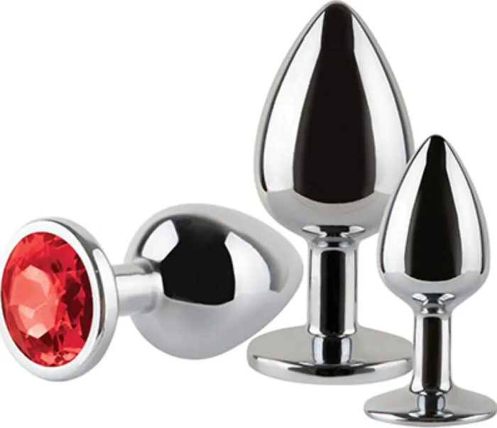 These are a set of three shiny silver metal anal plugs designed to take you up through sizes with confidence. Each plug shares the same elegant, tapered profile and a flat base finished with a circular jewelled detail that gives a reliable grip for insertion and removal. Because they’re metal, they feel firm and smooth — you can cool or warm them for extra sensation and they won’t flex under pressure, so you get precise, controlled sensations.
