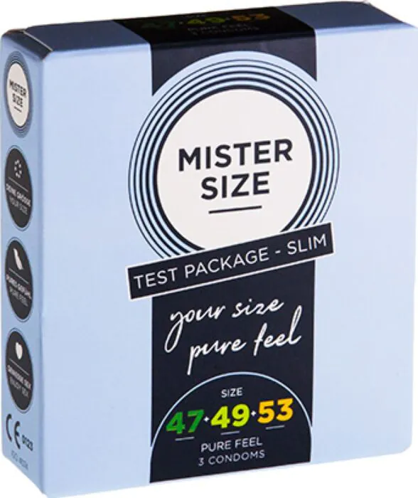 Experience a tailored fit with Mister Size condoms. This pack includes sizes 47, 49, and 53, all designed for maximum comfort and natural sensation.
