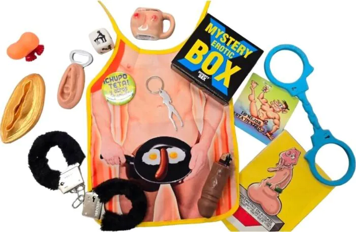 Each Mystery Box contains a selection of playful gag items, including joke cards, stickers, and various humorous erotic articles. The exact contents vary, ensuring a distinctive surprise every time.