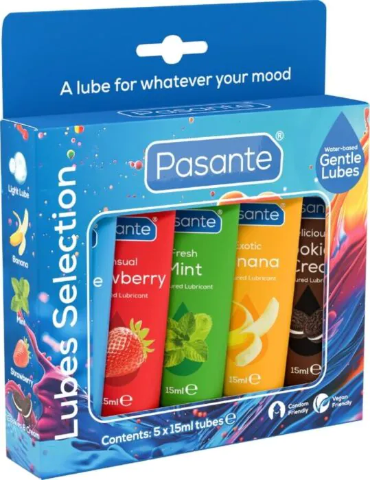 This Pasante mini pack gives you five small tubes of flavoured, water-based lubricant — a simple bit of kit to keep by the bedside or in your travel bag. The point is variety and convenience: each 15ml tube contains a different flavour so you can try what you prefer without committing to a full bottle. The formula is non-sticky, easy to wash off and designed to work with condoms and sex toys, which makes it useful for both everyday use and for adding flavour to oral contact.