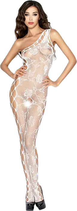A white fishnet bodystocking from PASSION WOMAN (model BS036) with an open crotch and embroidered accents. One-size design stretches to fit many shapes, offering a breathable, revealing layer for intimate wear. Choose this if you want a decorative, lightweight piece rather than structured support.