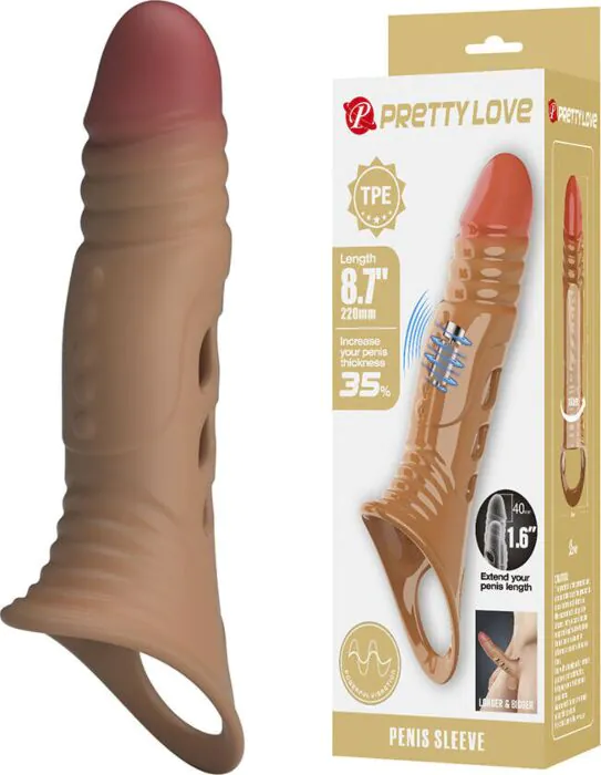 Transform your intimate moments with the Pretty Love vibrating penis sleeve, designed for added length and girth. Perfect for those eager to amplify their experience during penetration.