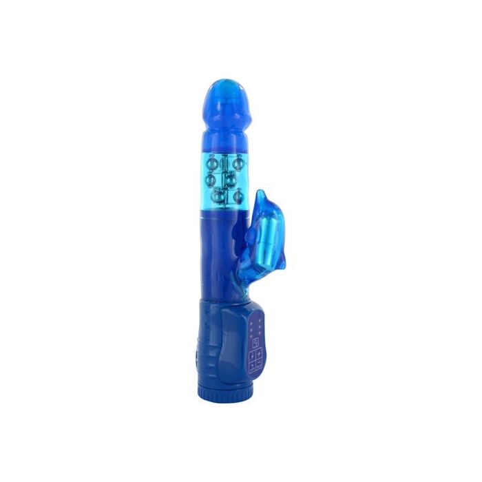 Estimulador de clítoris... perlas giratorias... estamos hablando de un vibrador de alta tecnología llamado Twinturbo Dolphin Vibrator Blue, está fabricado en gelatina de alta calidad en color azul cristal y además de la incorporación del estimulador de clítoris y las perlas giratorias, también cuenta con el movimiento de su cabeza que gira sobre sí misma en ambas direcciones.