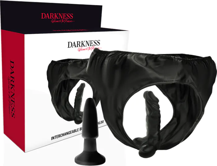 Dive into the realm of pleasure with the Darkness harness, featuring interchangeable dildo and plug. Crafted from quality PU leather, it's perfect for both beginners and experienced enthusiasts looking to explore new sensations.