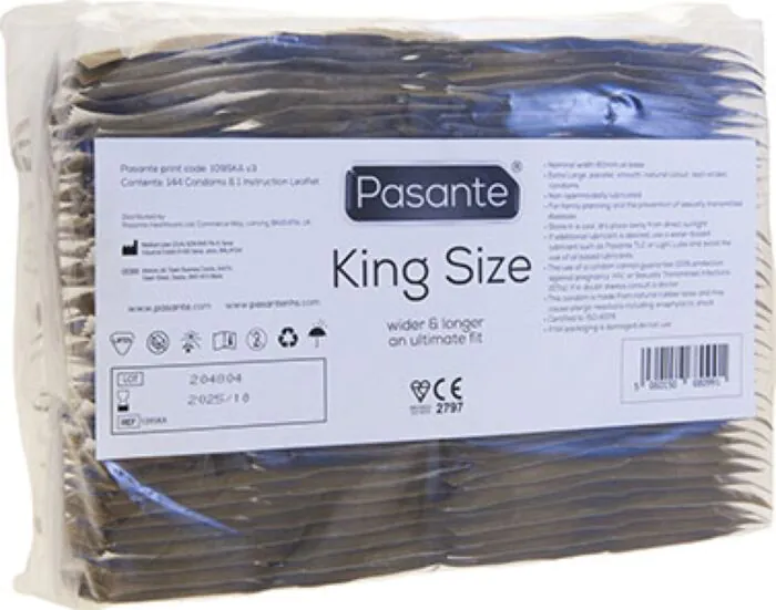 Pasante King Size is a roomy, latex condom with a 60 mm nominal width, lubricated (no spermicide) and finished smooth. It has a straight shape with a reservoir tip and a transparent look. If you need a larger fit and prefer a pre-lubricated, classic latex option, this is a practical choice — supplied in bulk packs of 144 units for regular users and clinics.