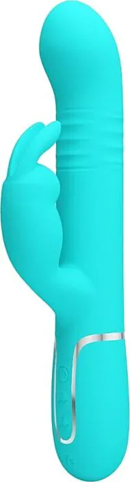 Think of the PRETTY LOVE Coale as a two-way approach to internal and external stimulation. It has twin motors — one in the tip and one in the external arm — so internal G‑spot thrusting and clitoral vibration work together rather than independently. The single row of rigid beads moves up and down for a textural stimulus and there's a Burst Climax button for short, intense bursts when you want them. It's made from ABS silicone and comes in an aqua‑green finish.