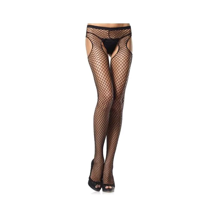- Black industrial net pantyhose with openings at the crotch and hips, simulating a garter belt.