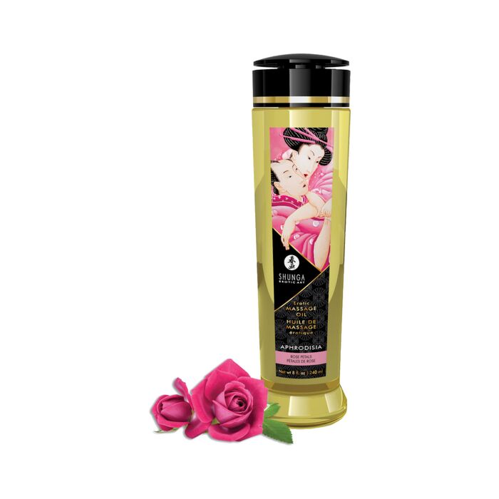 SHUNGA EROTIC MASSAGE OIL APHRODISIA es un aceite de masaje sensual de origen ORIENTAL de alta calidad, compuesto por una mezcla se aceites esenciales de almendras dulces, semillas de uva, sésamo, aguacate, esencia pura de Ylang-Ylang y Yohime. Sensual aroma de PETALOS DE ROSA, estimulante de todos los sentidos, especialmente seleccionado por su suavidad al extenderlo sobre la piel sin dejar sensación grasienta. Fabricado según la tradición milenaria oriental, con este aceite de una dulzura absoluta, te deslizarás fantásticamente sobre el cuerpo de tu amante produciendo una sensación AFRODISÍACA. Testado dermatológicamente, no produce ninguna reacción alérgica y es totalmente inocuo para la piel. Envase transparente de 240 ml.