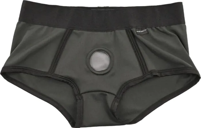 A boxer-style strap-on harness from Sportsheets designed to feel like everyday underwear. Soft, stretchy fabric and an elastic waistband give a snug, supportive fit for pairing with a compatible dildo and up to two small bullet vibrators. Choose this if you want a low-profile, wearable harness for regular use rather than a heavy-duty, fully adjustable harness for extreme play.