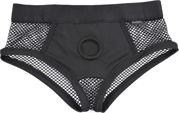 The Sportsheets EmEx XL Fishnet Fit is a boxer-style harness made for everyday wear. Soft, stretchy fabric and an elastic waistband give a secure, comfortable fit while mesh at the back adds a cheeky look. It accepts a dildo via a 38.1mm O-ring and has two pockets for bullet vibrators, so you can wear it as underwear or in play.