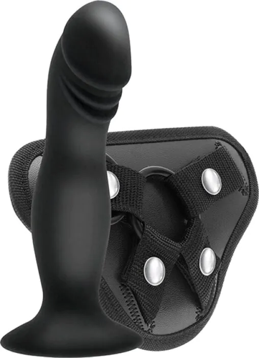 In store I’d show you the Strappy set and point out the two things that make it practical: a semi‑realistic silicone dildo with a powerful suction cup, and a harness built from adjustable nylon straps with two ring positions. That means you can use the dildo as a strap‑on or remove it and stick it to a smooth surface for solo play. There’s a discreet internal pocket to take a small mini vibrator (sold separately) for clitoral stimulation while you wear it.