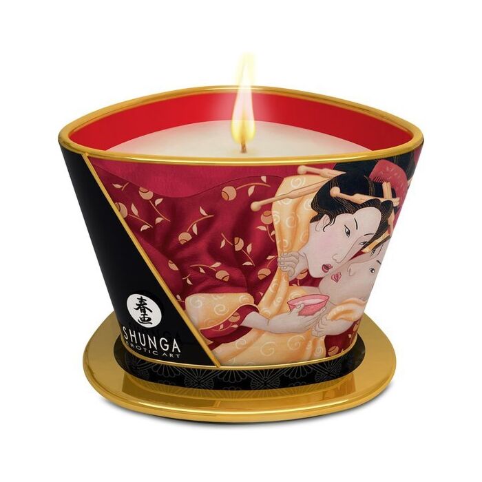 Light up the flame of passion with Shunga's strawberry massage candle! Picture an intimate and sensual atmosphere, where the sweet aroma of strawberries and champagne awakens your senses. With 170 ml of pure pleasure, this massage candle will immerse you in a unique experience of softness and sensuality. Discover the erotic world of Shunga, where each product is an invitation to the pleasure of the senses. Let its natural ingredients transport you to a universe of sensuality and eroticism. Turn your intimate moments into a work of art with Shunga's massage candle. How to use it? Light the wick, let the candle create a warm ambiance, and pour the warm oil onto your partner's skin. Enjoy a sensual massage that will awaken all their senses. Dare to explore new sensations with Shunga's strawberry massage candle. Pleasure is in your hands!