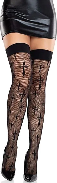 Unleash your inner seductress with these striking thigh-high stockings. Featuring a bold fishnet design and gothic crosses, they’re great for adding allure to any outfit.