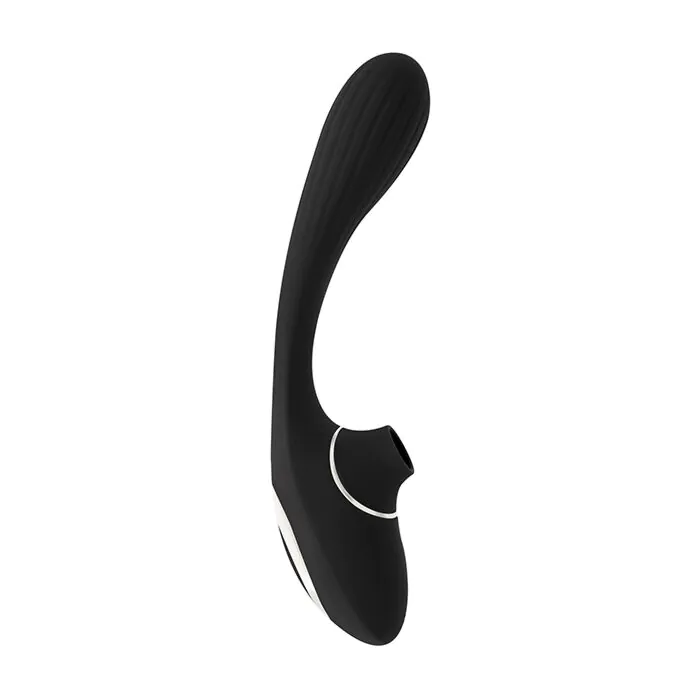 This is a dual‑stimulation toy designed to give simultaneous internal and external stimulation. The insertable shaft is soft with a rounded tip and a flexible neck so it sits comfortably against the G‑spot, while a separate suction unit targets the clitoris. Because it has two independent motors and simple two‑button controls, you can run vibration and suction together or favour one over the other.