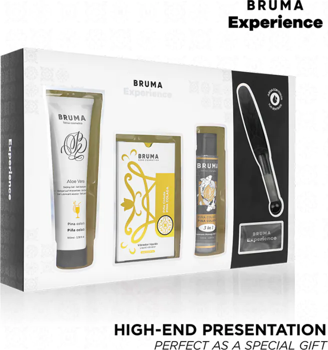 Experience vibrant pleasure with the BRUMA XPERIENCE kit, featuring a liquid vibrator designed to enhance desire and intimacy. This set includes a lubricant, oil, feather, and blindfold, inviting couples to indulge in playful exploration.
