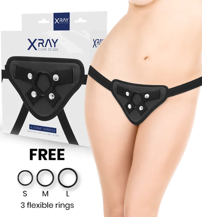 A comfortable, adjustable strap-on harness designed to work with X RAY dildos. Comes with three silicone rings to give you a better fit across different shaft sizes, and nylon straps that tighten securely without digging in. Good for newcomers wanting control and for experienced users who value stability and a luxury finish with metallic details.